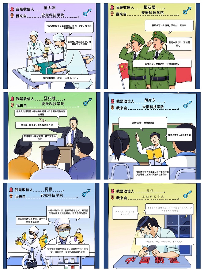 物联网工程191班田辰坤说:“青春无限,不负韶华。我愿意用自己有限的岁月完成作为一名中国新青年该完成的任务,承担应有的责任,让理想成为现实,不负自己,不辜负祖国培养”。数据科学与大数据技术192班徐璐瑶说:“以时间为纸,以行动为笔,弘扬五四精神,无论过去、现在还是未来,我们将永远砥砺前行,不负使命”。信息安全171班徐心宇说:“青年的我们是未来中国的脊梁,定不负期望,用自己行动展现自己的家国情怀和责任担当,成为有理想、有本领、有担当的新时代青年”。