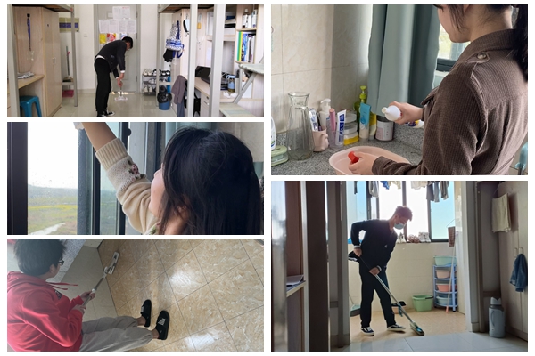 宿舍里,汪琦指导同学们清理宿舍卫生死角、消毒、通风,从床铺到阳台、从床架到床底,从桌椅拐角到宿舍墙角,认真细致地对寝室进行全面彻底的清洁卫生大扫除,做到环境卫生不留死角,清洁消毒不留空白,共同营造良好的生活环境和学习环境。