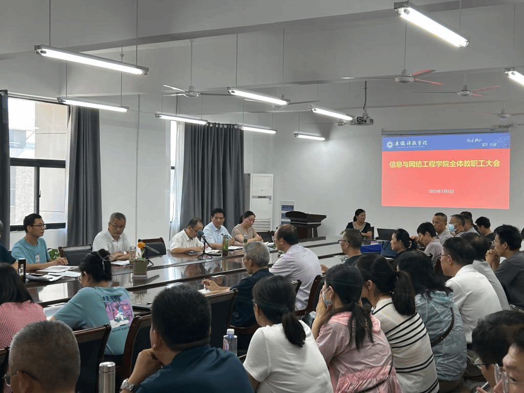 7月5日下午,信息与网络工程学院在尚行楼B418会议室召开教职工大会部署期末和暑期重点工作,学院党政领导及全体教职工参加会议,会议由学院党委书记王振其主持。