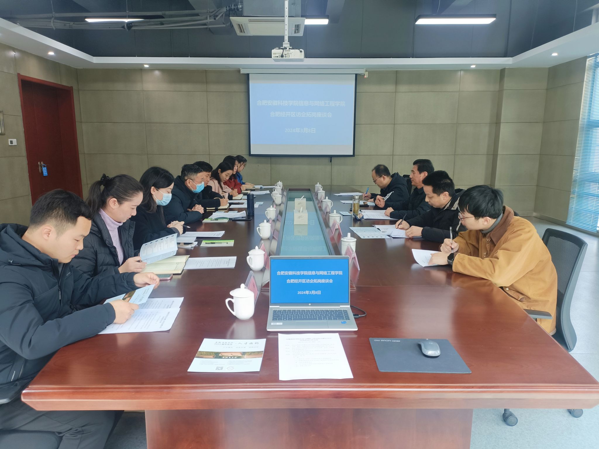 参观结束后,在开发区创新创业园会议室开展了“政、校、企”三方交流和座谈。开发区人力资源中心主任张华、企业服务部部长焦妮娜,安徽满辰科技集团股份有限公司人事经理和招聘主管,安徽合华信息科技有限公司人事经理,善诚科技发展(合肥)有限公司招聘经理等参加座谈。张华介绍了开发区的基本情况和开发区的发展情况,详细介绍了开发区的产业布局、人才需求以及人才引进政策等情况。各企业代表分别介绍了公司的基本情况、岗位需求情况、岗位要求、薪资待遇等。余宏杰简要介绍了学院的人才培养、科研与社会服务、师资队伍建设等情况。座谈会上还就2024届毕业生招聘与就业、2025届毕业生实习、校企合作等进行了广泛的讨论和交流。