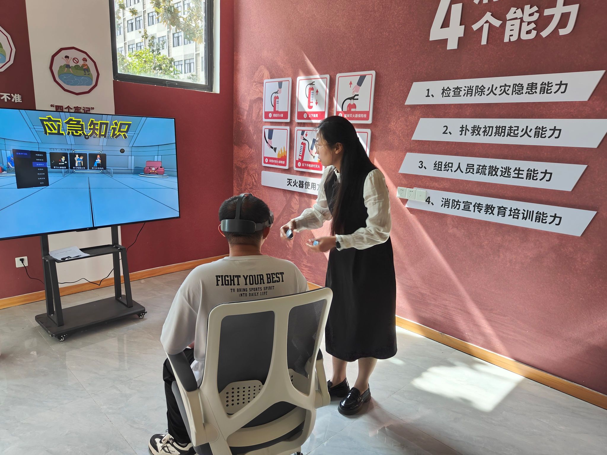 活动中,学生依次佩戴VR眼镜学习消防安全教育知识,通过虚拟现实手段,使同学们沉浸式体验各种灾害的模拟现场,实现可看、可听、可感的全方位体验。同学们通过虚拟现实的方式来排查宿舍的隐患,找到宿舍中常见的消防安全隐患问题;身临其境感受火灾现场,模拟在大火、浓烟中正确的逃生自救方法,学习正确使用灭火器、消火栓进行灭火。模拟灾害现场的情境提高了他们的自救能力和逃生能力,使同学们更加明确,一旦发生紧急情况,如何正确扑救、如何正确疏散及如何自救和逃生。