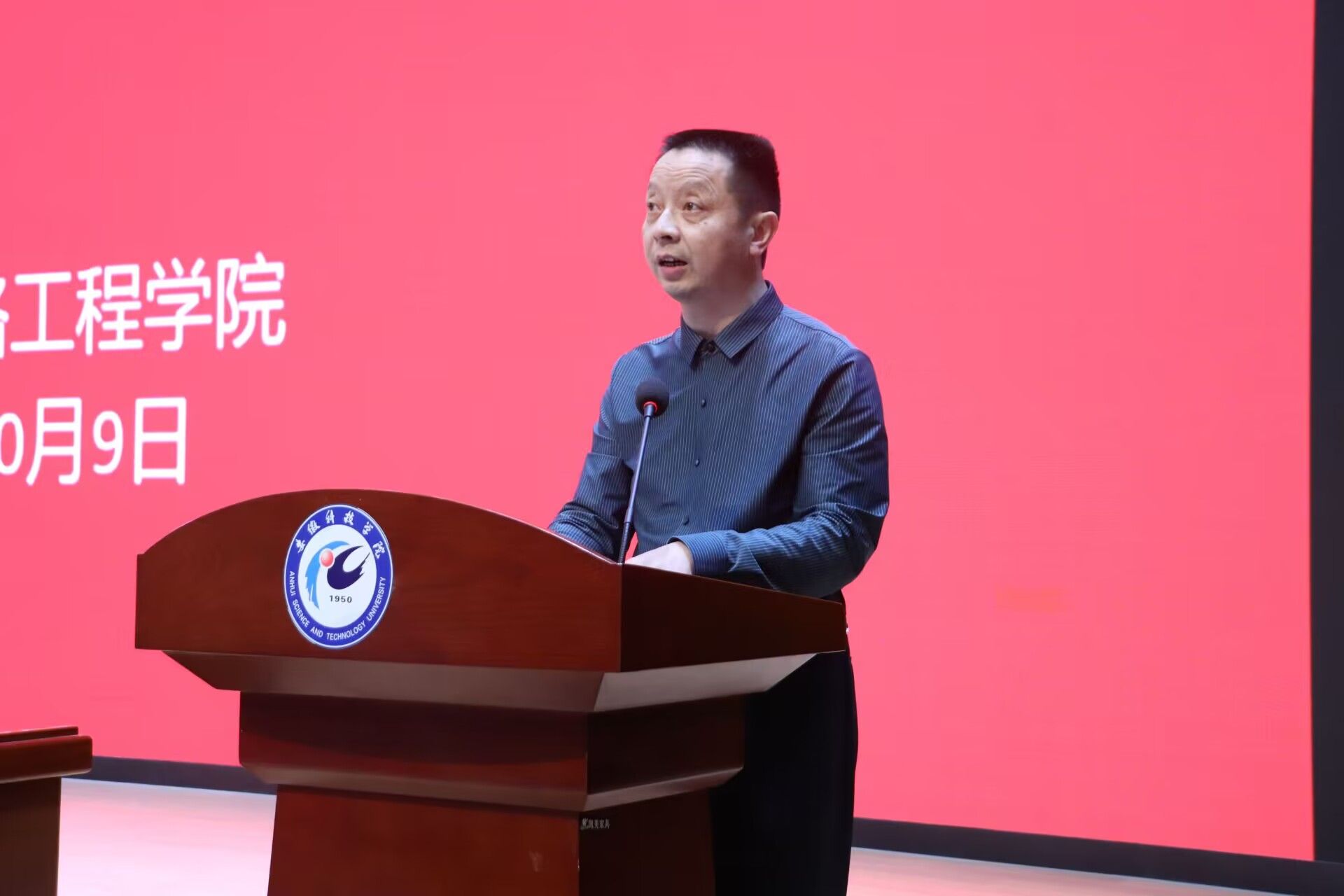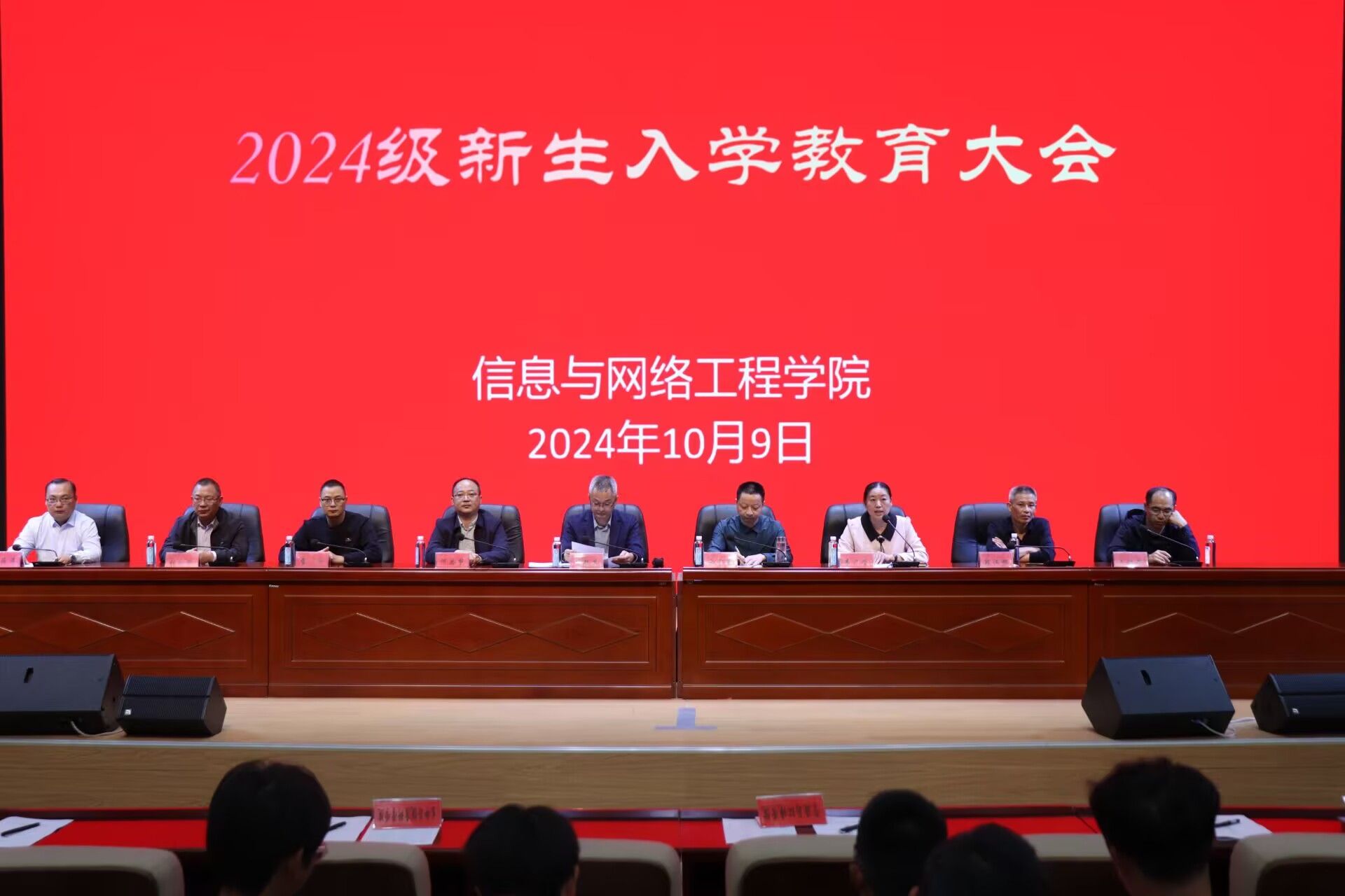10月9日中午,信息与网络工程学院在信息中心东辅楼二楼报告厅召开2024级新生入学教育大会。学院党政领导、各系室主任、教师代表高海涛、全体辅导员及2024级全体新生参加会议。会议由学院党委副书记韦乃学主持。