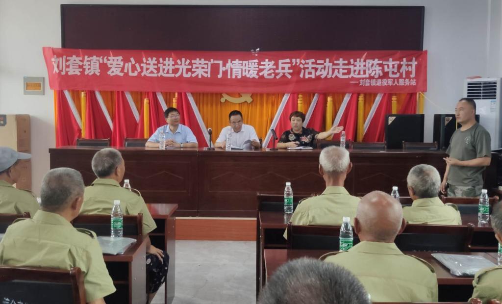 在萧县刘套镇陈屯村,实践团有幸参与了镇里举办的“爱心送进光荣门·情暖老兵”活动。活动中,村党支部刘书记对退役老兵们在村脱贫攻坚和疫情防控工作中所做的各项工作给予了充分的肯定和高度的赞赏,向退役老兵们发放了丝绵被、衬衫等慰问品,并向老兵们致以节日的问候。老兵们的强烈爱国主义精神和勇于担当,冲锋在前的社会责任感,无不让团队成员们为之动容。