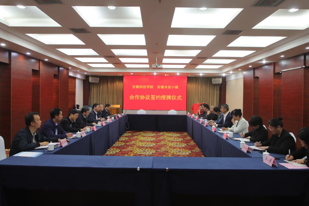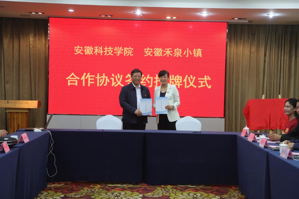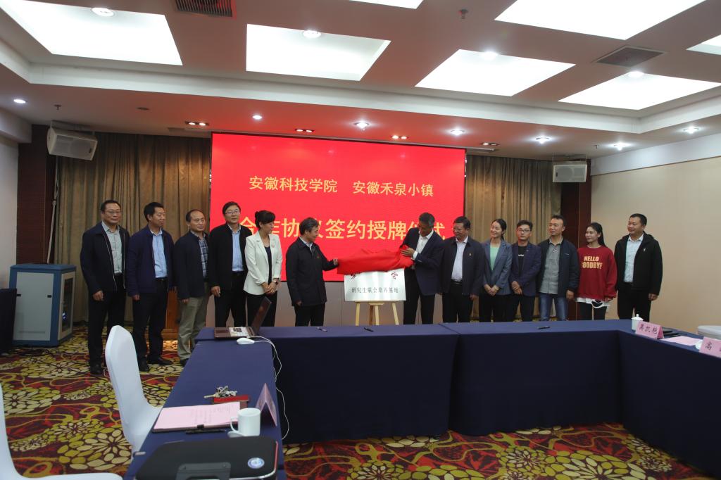 10月13日下午,我校与安徽禾泉小镇合作协议签约授牌仪式在安徽禾泉小镇会议室隆重举行。安徽禾泉小镇董事长蒋保安,总经理付莉莉,副总经理耿珂,我校党委书记蒋德勤,党委委员、副校长李升和,研究生处处长张春雨,食品工程学院院长杜传来,马克思主义学院党总支书记杨仕勇、院长张德化,研究生处副处长靳二辉等出席会议。会议由付莉莉主持。