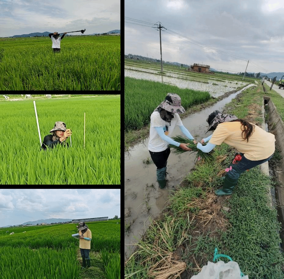 根据安排,志愿服务团队分为数字农业研究院与业务部两个组别分别开展活动。数字农业研究院团队成员在研究院相关技术人员的指导下前往峨桥基地开展采集实时田间水稻数据,包括水稻株高、叶面积、分蘖数、生物量等,进行田间整体与特写图片拍摄,学习识别水稻生育期及病虫草害防治等专业知识。同时辅助技术人员对水稻进行了无人机施放农药,对水稻田中的病虫草害进行相应的防治工作;利用无人机采集到的多光谱图片分析检测不同品种、不同时期、不同疏密条件下的水稻长势。烈日炎炎,但团队成员不辞辛苦,无惧炎热,带上草帽,穿上水鞋,及时跟进数据采集进度,积极主动与技术人员沟通,真正将专业知识践行在田间地头。