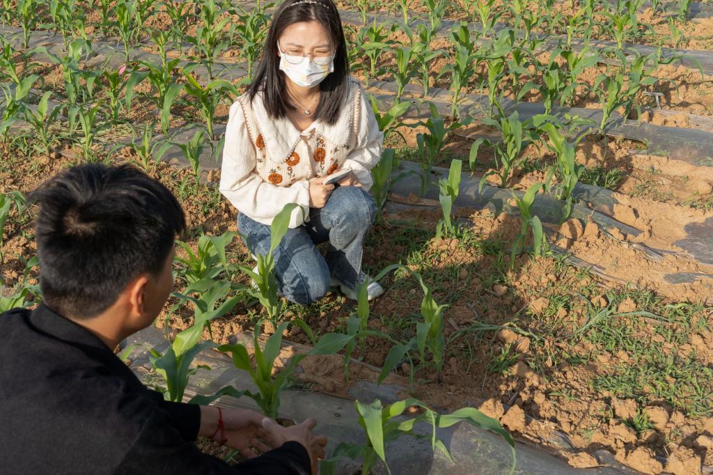 这些整整齐齐的40cm高的青翠玉米苗,细看下来,竟是朝着同一个方向。“在玉米播种的时候,我们采用定向种植的方式,每一个种坑里我们会撒多粒种子,并且尽量使种胚向上,籽粒摆放方向保持一致。玉米出苗后,朝向不对的种苗还会被剔除”,方习胜说。这当然不是为了美观才下的功夫,主粮农作物的种植本身就是一件严肃而艰辛的事。而如此的精耕细作就是为了解决如丘陵地带和山区土地面积紧缺的问题。控制玉米朝向是为了能加大玉米种植密度,在不损伤玉米果实质量的基础上,尽可能地缩短玉米植株距离,以实现增产效果。目前普通甜糯玉米种植密度一般为每亩3000株左右,试验田将试种的甜糯玉米种植密度按照每亩3000、3300、3500、4000、4500株进行种植对照,探索不同生长条件下最佳的种植密度。课题组的指导老师之一李少昆教授,曾在2020年采用MC670玉米品种,在新疆奇台进行密植实验时达到了惊人的亩穗数8642株,创造了亩产1663.25KG全国玉米高产记录,而2018-2020年,我国玉米平均单产为亩均416.7 KG。目前这项技术已经在我国西北地区推广开来,课题组正在尝试将该项技术向中部地区延伸。