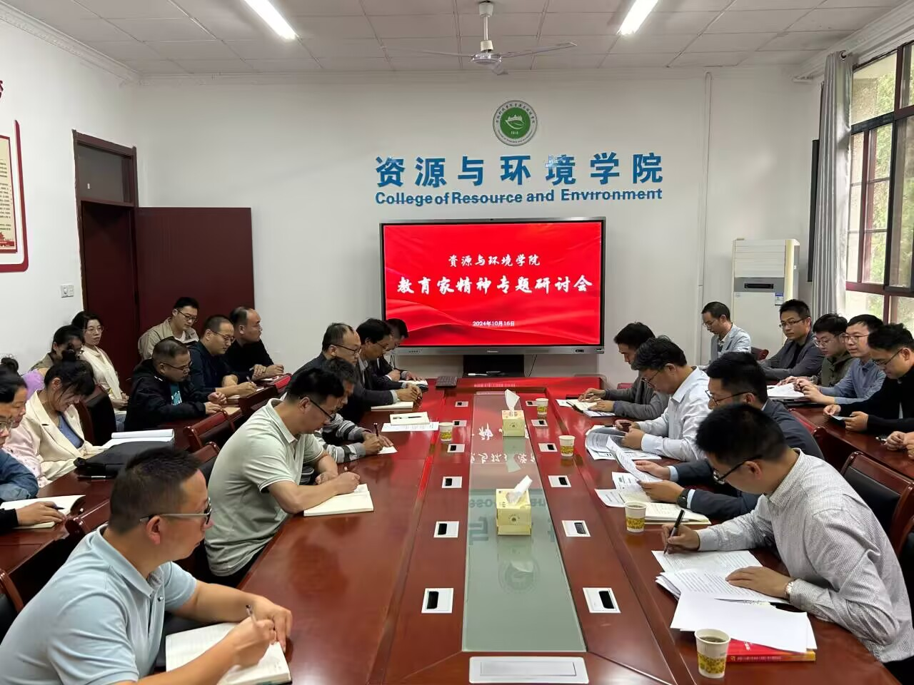 为深入学习贯彻全国教育大会精神,全面落实习近平总书记关于教育的有关重要论述,进一步加强学院师德师风建设,教育和引导全体教师大力弘扬和践行教育家精神。10月16日下午,资源与环境学院于学院会议室召开弘扬“教育家精神”专题研讨会。校党委委员、副院长李升和出席会议。资源与环境学院党政领导以及全体教职工参会,会议由学院党委副书记沈树周主持。