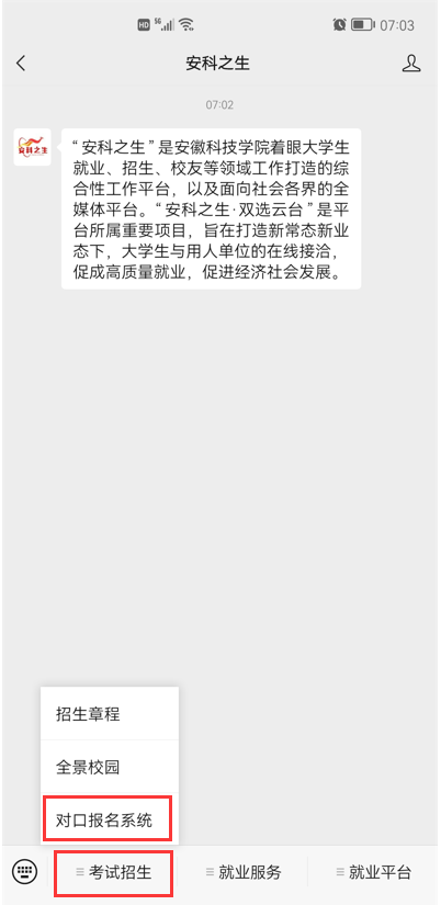 第一步:请扫描下方二维码,关注开云官方注册招生办公室官方微信公众号“安科之生”,选择“考试招生”菜单,点击“对口报名系统”。