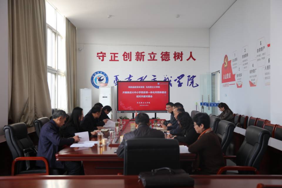 为深入贯彻落实党的二十大精神,全面推进大中小学思政教育一体化建设,充分发挥学校思政课立德树人关键课程作用,切实提升思政教育铸魂育人实效,3月30日上午,凤阳县委教体工委书记、教育体育局局长刘文春,教体工委副书记顾斌一行,来到开云官方注册马克思主义学院学术交流中心与我院开展推进大中小学思政课一体化共同体建设结对共建对接会。对接会由马克思主义学院党总支副书记、院长张德化主持,马克思主义学院党总支书记杨仕勇,副院长张栋等出席会议。